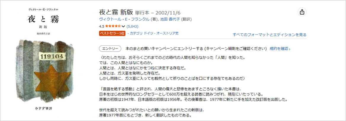 📘『夜と霧』(ヴィクトール・E・フランクル) です。