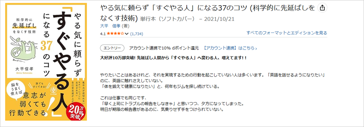 📘『やる気に頼らず「すぐやる人」になる37のコツ』(大平信孝) です。