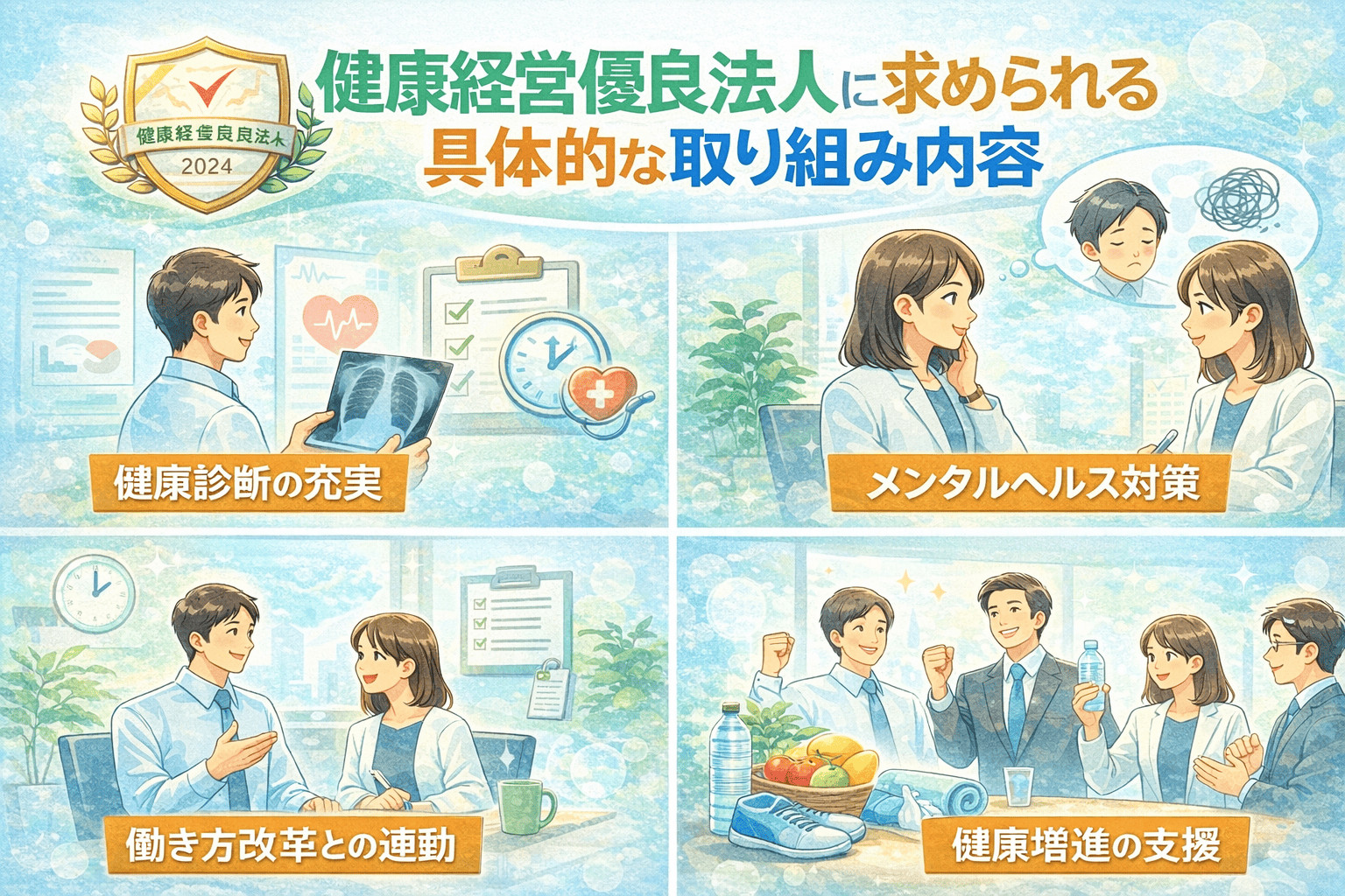 健康経営優良法人に認定される企業は、少なくともこれらの施策を「形式だけでなく、実態として」運用していることが求められているのです。